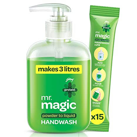 Godrej Protekt Mr Magic Powder To Liquid Handwash offers a unique and convenient solution for effective hand hygiene. This innovative powder transforms into a gentle, cleansing liquid upon contact with water, ensuring thorough removal of dirt and germs. Formulated with skin-friendly ingredients, it provides deep cleaning without drying out your hands. Ideal for maintaining hygiene in all environments, this handwash supports healthy skin and reduces the risk of infections. Easy to store and use, it combines efficiency with practicality, making it an essential addition to your daily hand care routine for lasting cleanliness and protection.