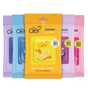 - Say hello to Godrej Aer Pocket, a range of bathroom air freshener available in 5 delightful fragrances. The pack contains one each of our variants - Misty Morning Meadows, Fresh Lush Green, Bright Tangy Delight, Violet Valley Bloom and Petal Crush Pink. You can now try them all and choose the one that delights you the most. Its unique power gel technology keeps your bathroom fragrant for 3-4 weeks and ensures that its fragrance reaches every corner of your bathroom.